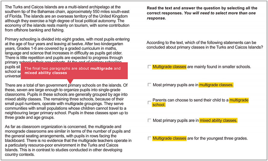 快速浏览回答选项, 注意任何重复的词汇,特别是形容词(如“多年级”)或名词(如“班级”)。如果同一个名词短语出现在很多选项中,答案很可能与该短语有关。
