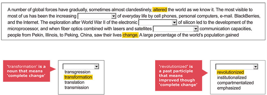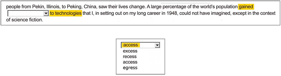 在下面的例子中,只有“access”符合“gained .............技术“。你需要 选择既符合含义 (获取访问) 又符合语法 (“访问”的词汇)。阅读空白页的两侧都能帮助你缩小选择范围。